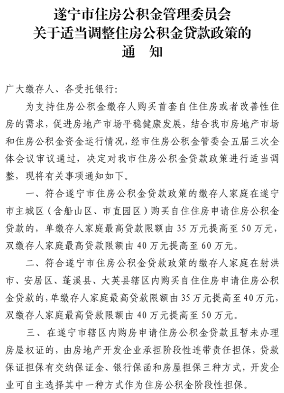 遂宁市住房公积金管理委员会日前调整了公积金贷款政策,缴存人家庭在遂宁市辖区购买第二套普通自住住房,首付款比例由40%降至30%。此外,缴存人家庭在遂宁市主城区(含船山区、市直园区)购买自住住房申请公积金贷款的,单缴存人家庭最高贷款限额由35万元提高至50万元,双缴存人家庭最高贷款限额由40万元提高至60万元。