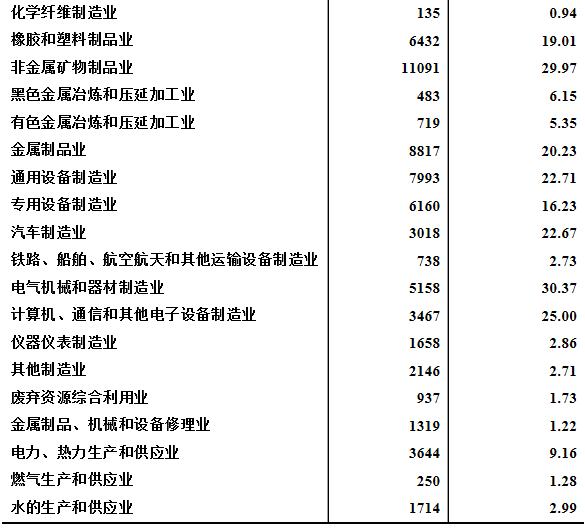 在工业企业法人单位中,采矿业1234个,制造业112657个,电力、热力、燃气及水生产和供应业5608个,分别占1%、94.3%和4.7%。在工业行业大类中,非金属矿物制品业、纺织服装服饰业、金属制品业行业企业法人单位数位居前三位,分别占9.3%、7.7%和7.4%。