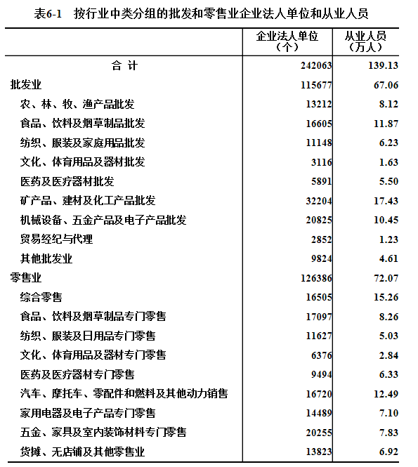 在批发和零售业企业法人单位中,批发业占47.8%,零售业占52.2%。在批发和零售业企业法人单位从业人员中,批发业占48.2%,零售业占51.8%(详见表6-1)。