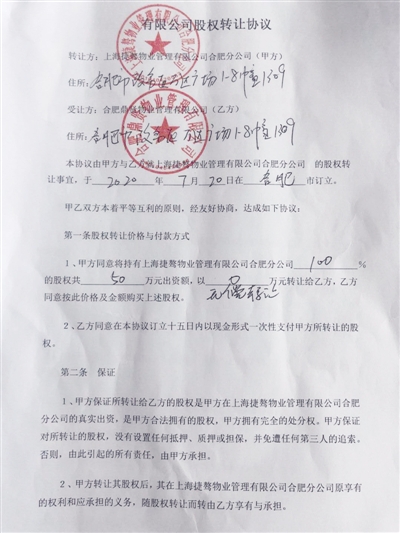 根据租客提供的该公司股权转让协议,7月20日,上海捷骜物业管理有限公司合肥分公司100%的股权共50万元出资额,以0元无偿转让给合肥这家物业管理有限公司。