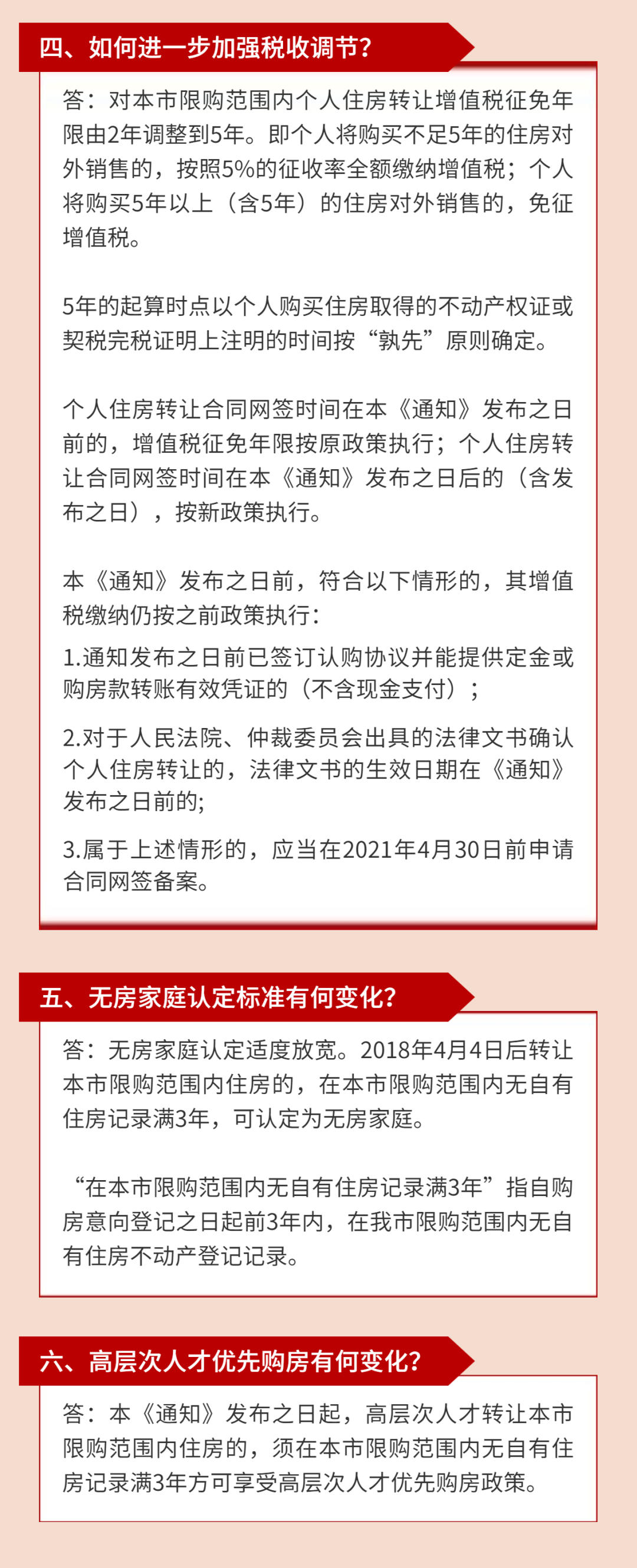 《通知》进一步加强税收调节,明确本市限购范围内,个人住房转让增值税征免年限由2年调整为5年。
