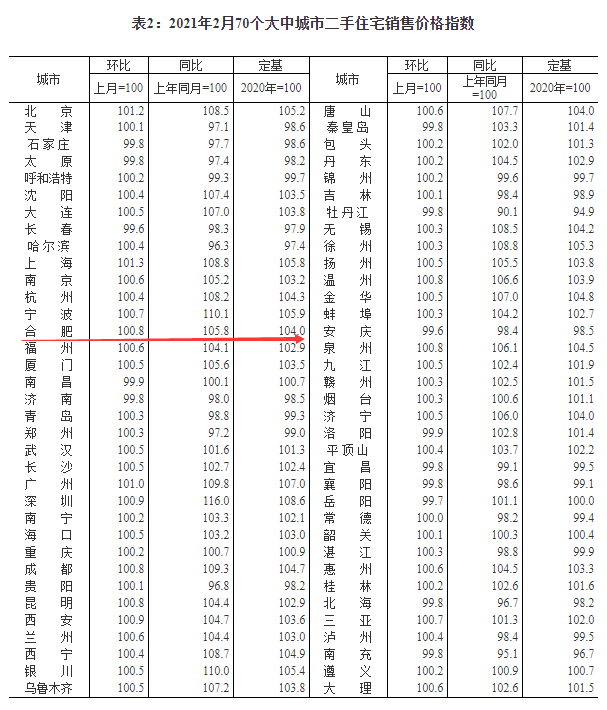 3月15日,国家统计局发布2021年2月份70个大中城市商品住宅销售价格变动情况。合肥新房销售价格指数环比上涨0.6%,同比上涨5%;二手房销售价格指数环比上涨0.8%,同比上涨5.8%。