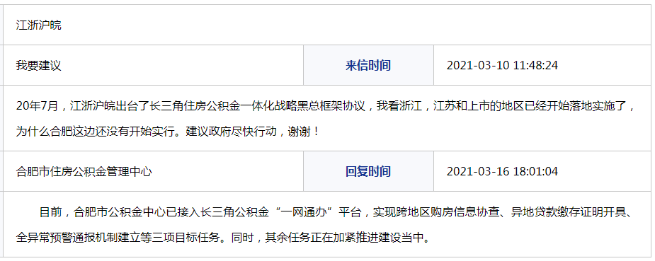 网友:2020年7月,江浙沪皖出台了长三角住房公积金一体化战略黑总框架协议,我看浙江,江苏和上海市的地区已经开始落地实施了,为什么合肥这边还没有开始实行。建议政府尽快行动,谢谢!