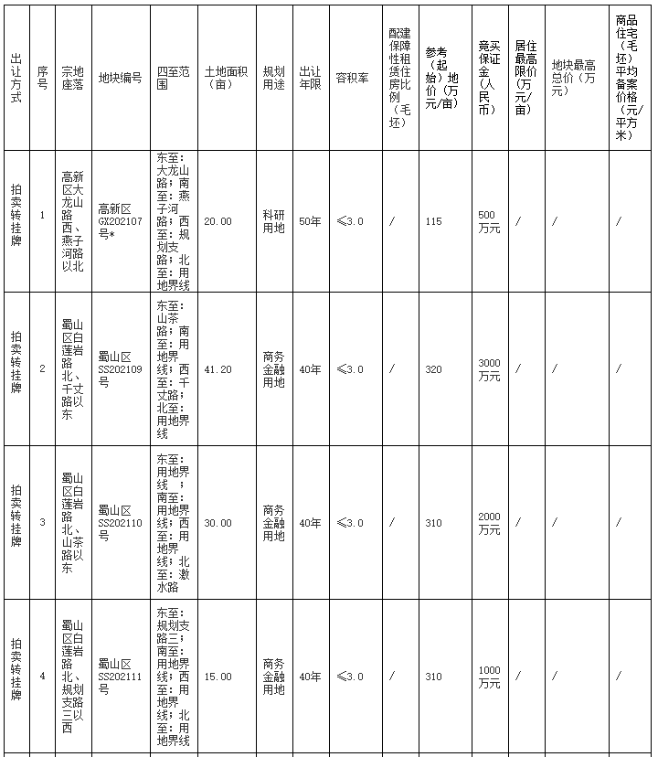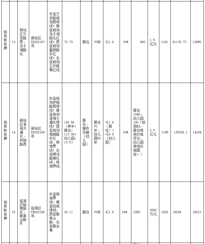根据市土地管理委员会决定,其中高新区GX202107号,蜀山区SS202109号、SS202110号、SS202111号、SS202112号、SS202113号、SS202114号、SS202115号、SS202116号、SS202117号、SS202118号,经开区JK202109号、JK202111号,新站区XZ202107号、XZ202108号,瑶海区YH202105号、YH202106号和庐阳区LY202108号等宗地由拍卖出让转为现场挂牌出让。挂牌日期为2021年9月16日至2021年9月29日,挂牌时间为上午9:00-11:00、下午3:00-5:00。挂牌截止转入现场竞价时间为2021年9月29日下午2:30时。