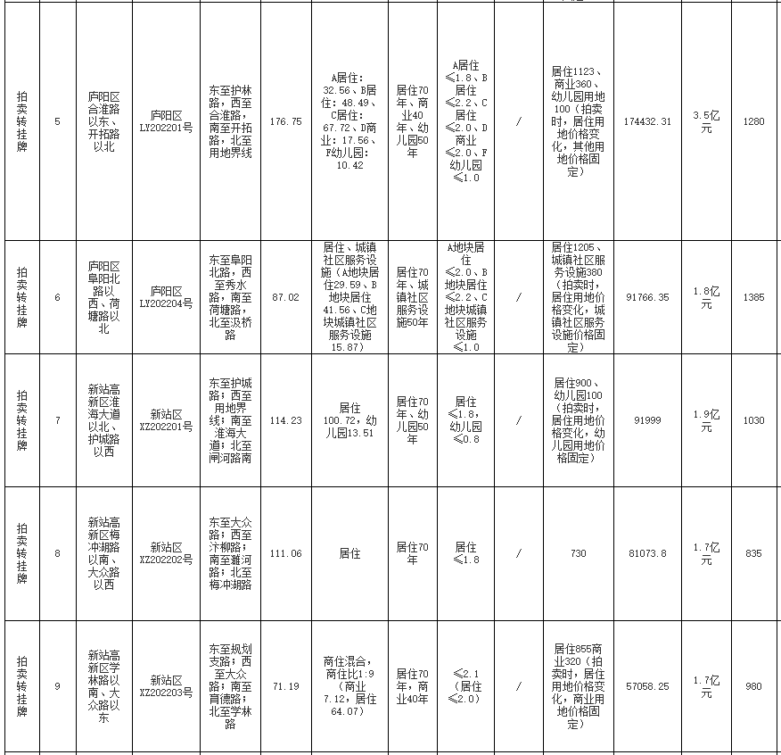 合肥市自然资源和规划局于2022年2月15日在合肥土地市场网等相关媒体发布了《合肥市国有建设用地使用权出让公告》(合自然资规公告 [2022] 6号和7号),公告以拍卖方式出让包河区BH202201号、02号;瑶海区YH202202号、03号;新站区XZ202201号、02号、03号、04号、05号、06号;庐阳区LY202201号、04号;蜀山区SS202202号;高新区GX202205号、06号宗地。