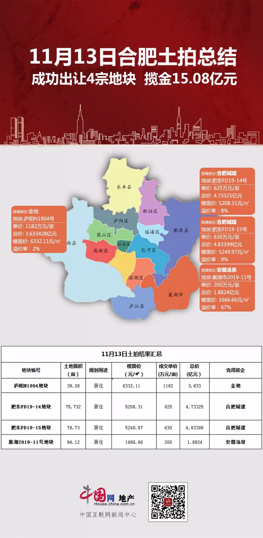 2、合肥城建以单价625万元/亩,总价4.73325亿元竞得肥东FD19-14地块,楼面价5208.31元/平米,溢价率7.76%。