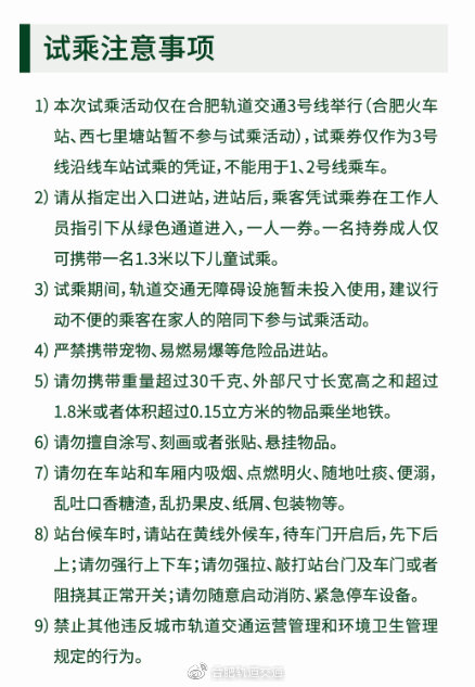 备受关注的合肥轨道交通3号线试乘活动来了。记者从合肥轨道交通获悉,为广泛征集广大市民对轨道3号线的意见、建议,进一步做好3号线初期运营前各项准备工作,计划于本月18日开始组织开展3号线试验性试乘活动。具体内容如下: