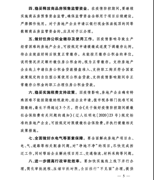 《措施》内容涉及推进项目有序开复工、保障土地供应完善管理服务、积极促进商品房入市和销售、稳妥释放商品房预售监管资金、做好住房公积金缴存及使用工作、稳妥实施税费支持政策、全面做好水电气等要素保障、进一步提高行政审批效率8项内容。
