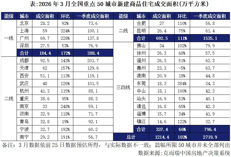 新房方面,根据克而瑞监测,3月份全国重点50城市新建商品住宅成交面积约1214万平方米,环比增加103%,同比减少27%,累计成交面积2720万平方米,累计同比跌28%,累计跌幅有所收窄。