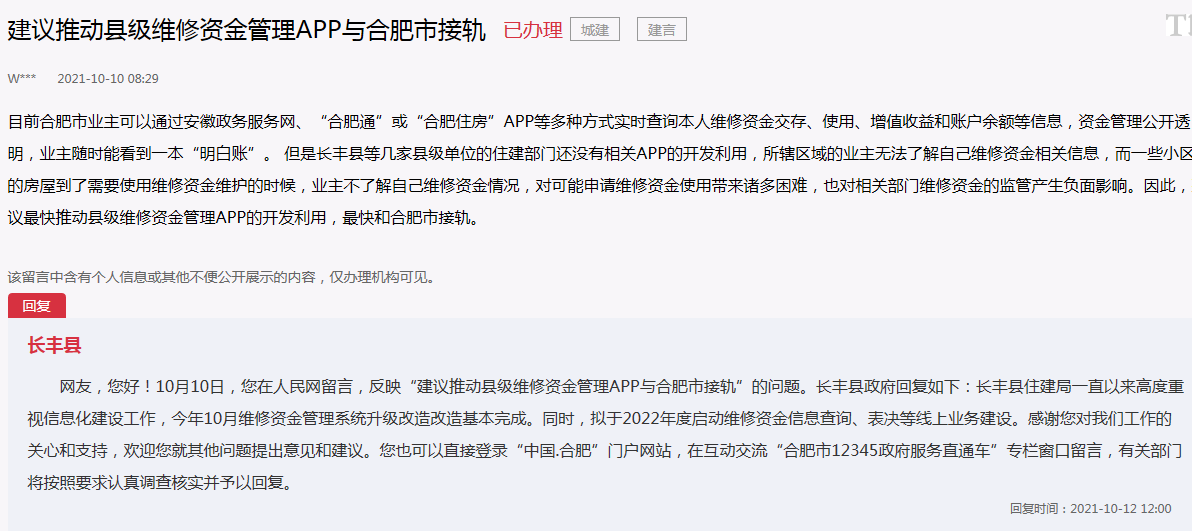 近日,有网友在人民网“领导留言板”中留言,称目前合肥市业主可以通过安徽政务服务网、“合肥通”或“合肥住房”APP等多种方式实时查询本人维修资金交存、使用、增值收益和账户余额等信息,资金管理公开透明,业主随时能看到一本“明白账”。但是长丰县等几家县级单位的住建部门还没有相关APP的开发利用,所辖区域的业主无法了解自己维修资金相关信息,而一些小区的房屋到了需要使用维修资金维护的时候,业主不了解自己维修资金情况,对可能申请维修资金使用带来诸多困难,也对相关部门维修资金的监管产生负面影响。因此,建议最快推动县级维修资金管理APP的开发利用,最快和合肥市接轨。