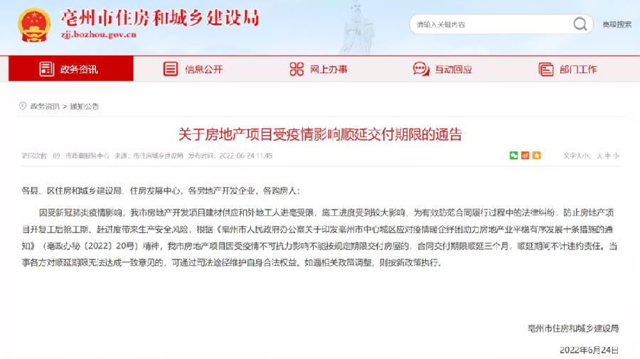 安徽亳州近日发布《关于房地产项目受疫情影响顺延交付期限的通告》明确,该市房地产项目因受疫情不可抗力影响不能按规定期限交付房屋的,合同交付期限顺延3个月,顺延期间不计违约责任。当事各方对顺延期限无法达成一致意见的,可通过司法途径维护自身合法权益。