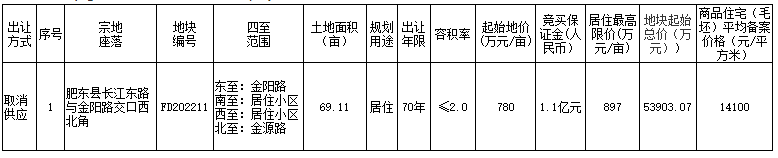 2022年7月1日,我局在合肥市土地市场网、合肥晚报等媒体上发布《肥东县国有建设用地使用权挂牌出让公告》(东自然资规公告(2022)53 号),公告出让位于肥东县长江东路与金阳路交口西北角FD202211地块,现取消供应。