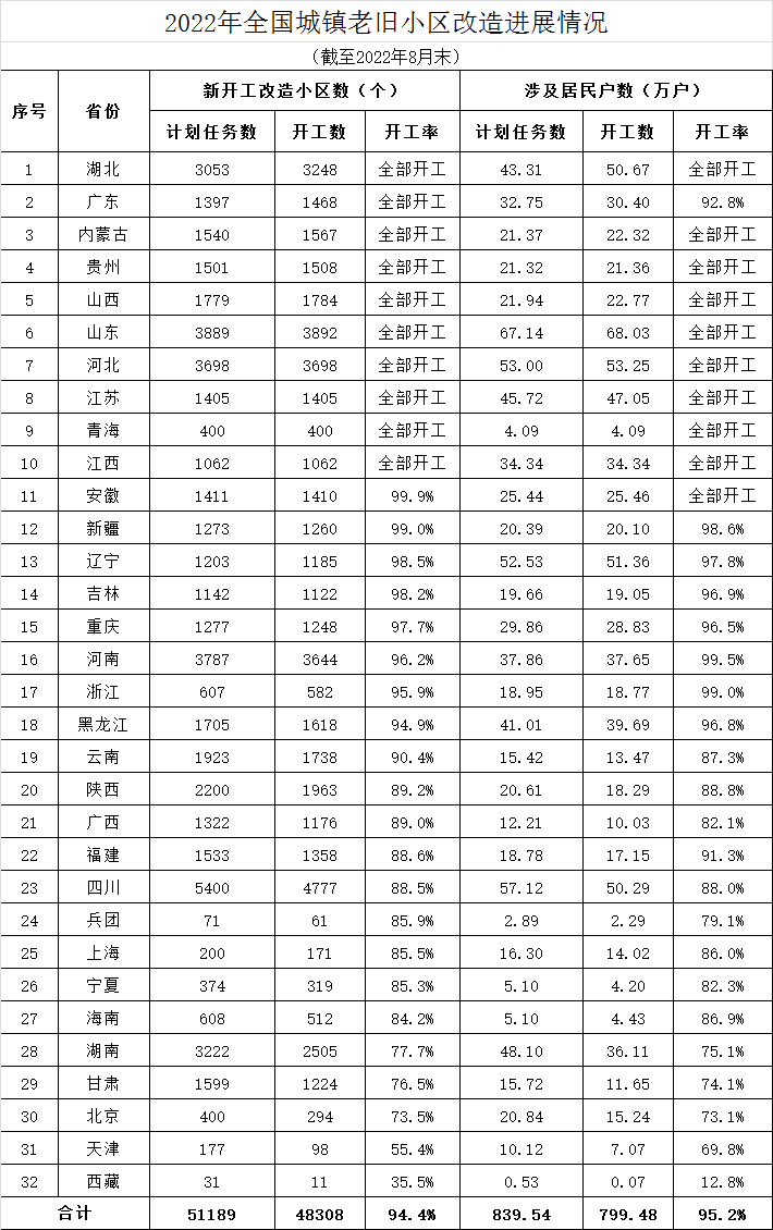 据住建部官网消息,2022年《政府工作报告》提出,再开工改造一批城镇老旧小区。经汇总各地统计上报数据,2022年全国计划新开工改造城镇老旧小区5.1万个、840万户。2022年1-8月份,全国新开工改造城镇老旧小区4.83万个、799万户,按小区数计占年度目标任务的94.4%。