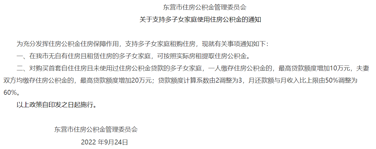 东营市住房公积金管理委员会近日发布《关于支持多子女家庭使用住房公积金的通知》。《通知》提出,对购买首套自住住房且未使用过住房公积金贷款的多子女家庭,一人缴存住房公积金的,最高贷款额度增加10万元,夫妻双方均缴存住房公积金的,最高贷款额度增加20万元;贷款额度计算系数由2调整为3,月还款额与月收入比上限由50%调整为60%。